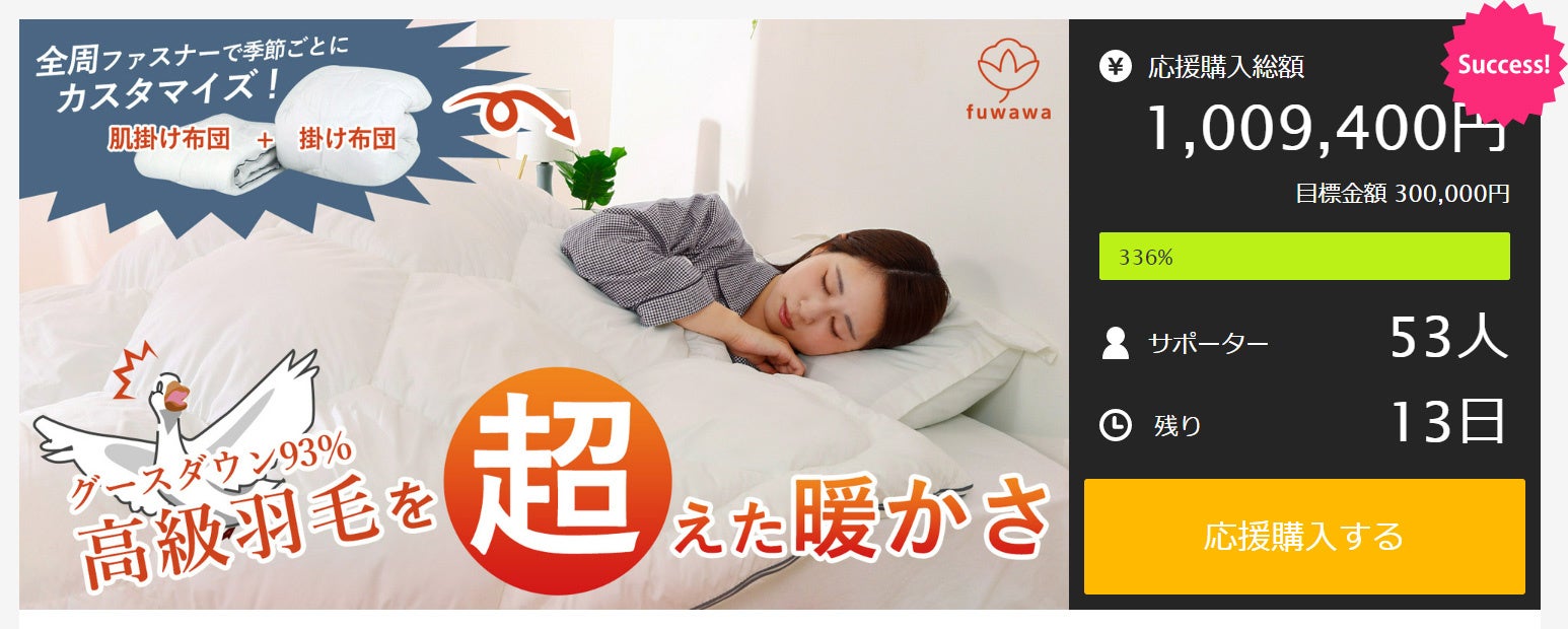サンリビング株式会社(本社:愛知県名古屋市)は、応援購入サービス「Makuake」にて好評発売中の『ツーレイヤー掛け布団』プロジェクトの目標金額300,000円に対し、300%以上の1,009,400円(2022年11月16日時点)と想定を上回るご支援をいただきました。