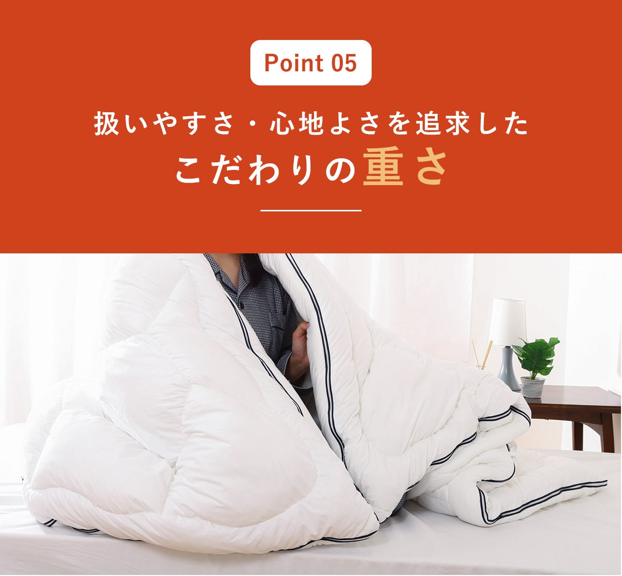 - 重い布団と軽い布団のメリットだけを良いとこどりした、ちょうど良い重さの2.2kgの充填量