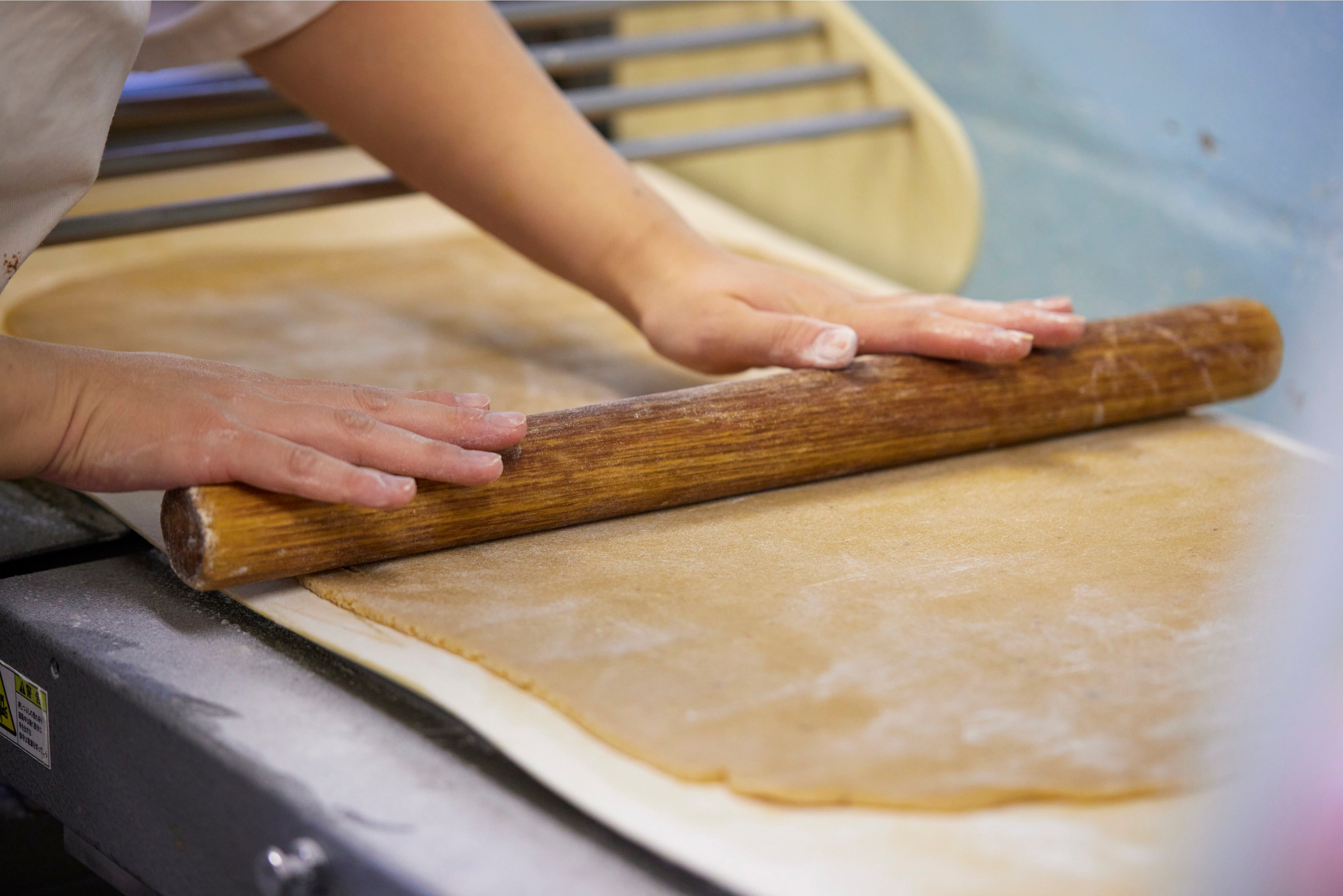 カイザーは余計な物はいっさい加えず、ひとつひとつ手づくりしています。樫の木の芯棒に薄い生地をかけていく作業を幾度も繰り返し、そろばん玉をつないだような形に焼き上げていきます。