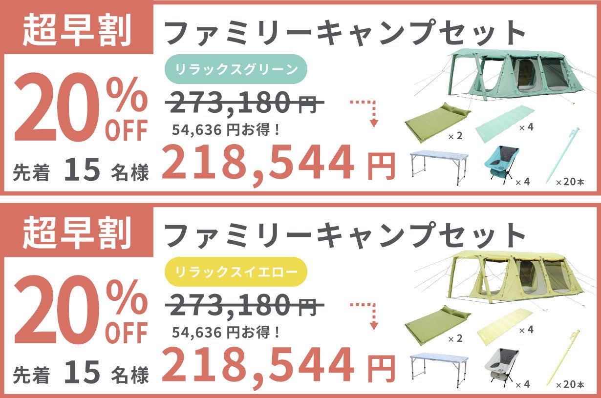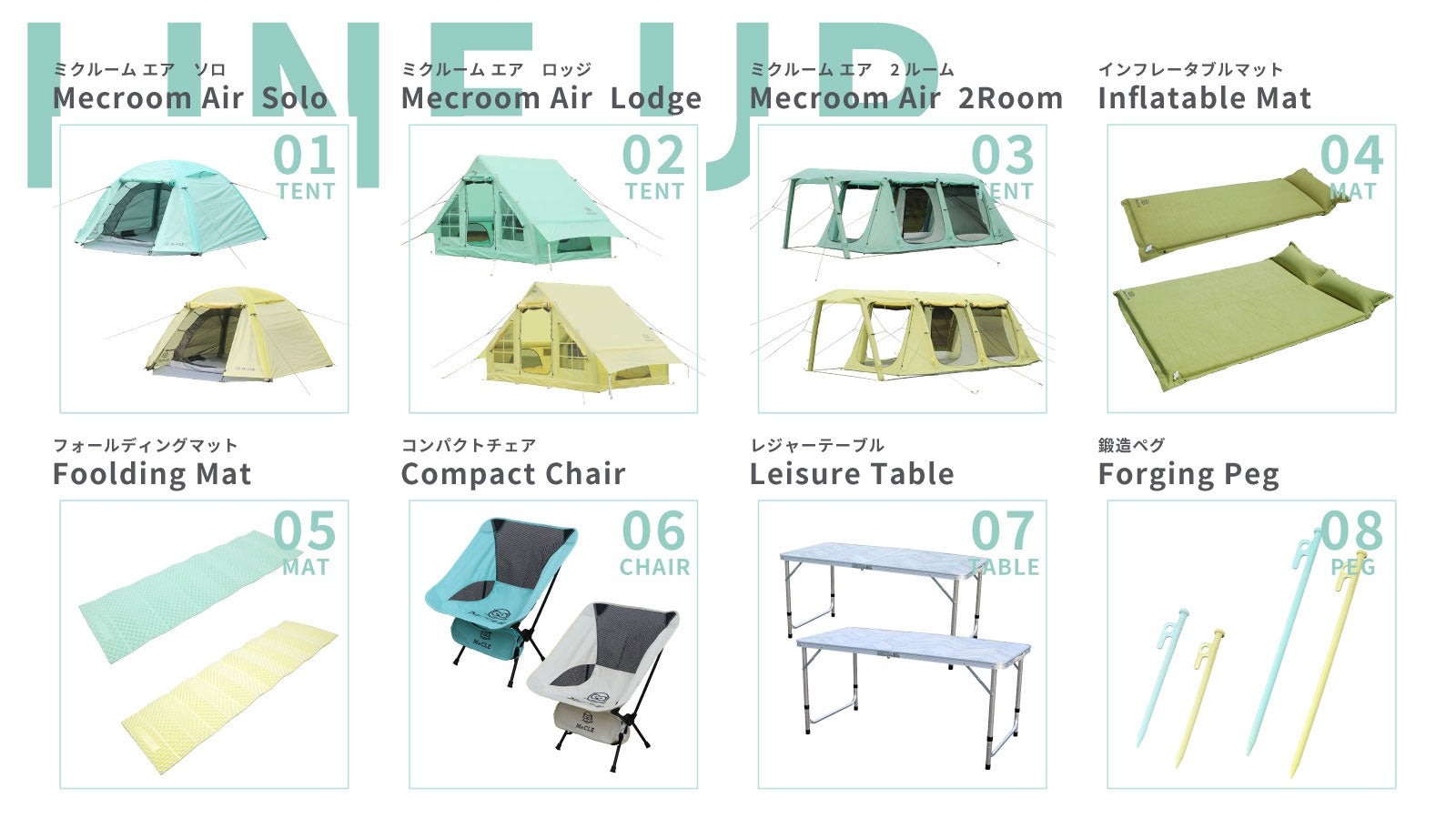 ポンプで空気を入れるだけで立ち上がるエアフレームテントをはじめテーブル、チェアなど、キャンプギアをおしゃれにコーディネート。10/21~11/29までMakuakeにて購入可能。