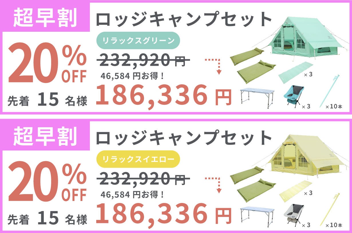 ソロ、デュオ、ロッジ、ファミリーといったキャンプシーンに合わせたテントセット