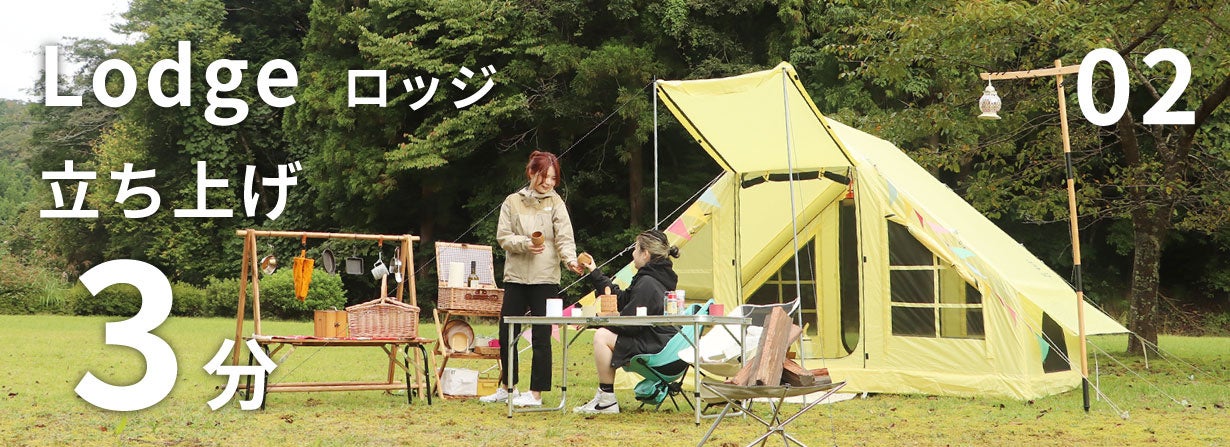 ブランドカラーである「リラックスグリーン」「リラックスイエロー」は、女性だけでなく男性や子供にも親しみやすく、テントやテーブルなどのトータルコーディネートでかわいいアウトドア・レジャーライフを演出します。
