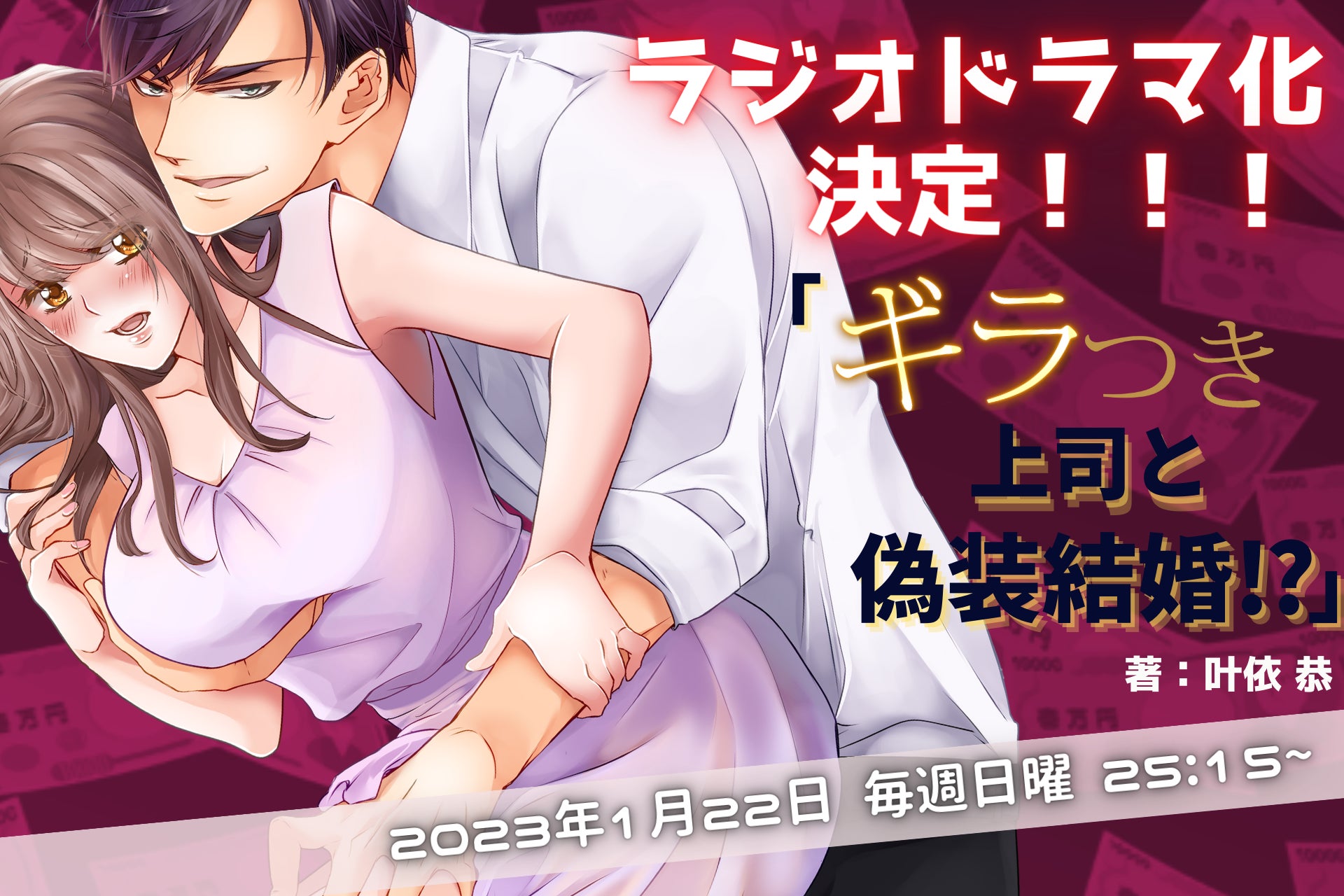 この度、『ギラつき上司と偽装結婚!?』を原作としたラジオドラマが、RKB 毎日放送にて 2023 年 1 月 22 日より毎週日曜深夜(25 時 15 分~25 時 30 分/全 10 回)放送されます。