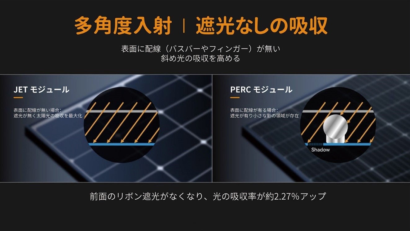 「JETシリーズ450W BSM450M10-54NHS」は、セル表面の配線なし構造により、見た目と性能の良さを両立する次世代ソーラーパネルです。
