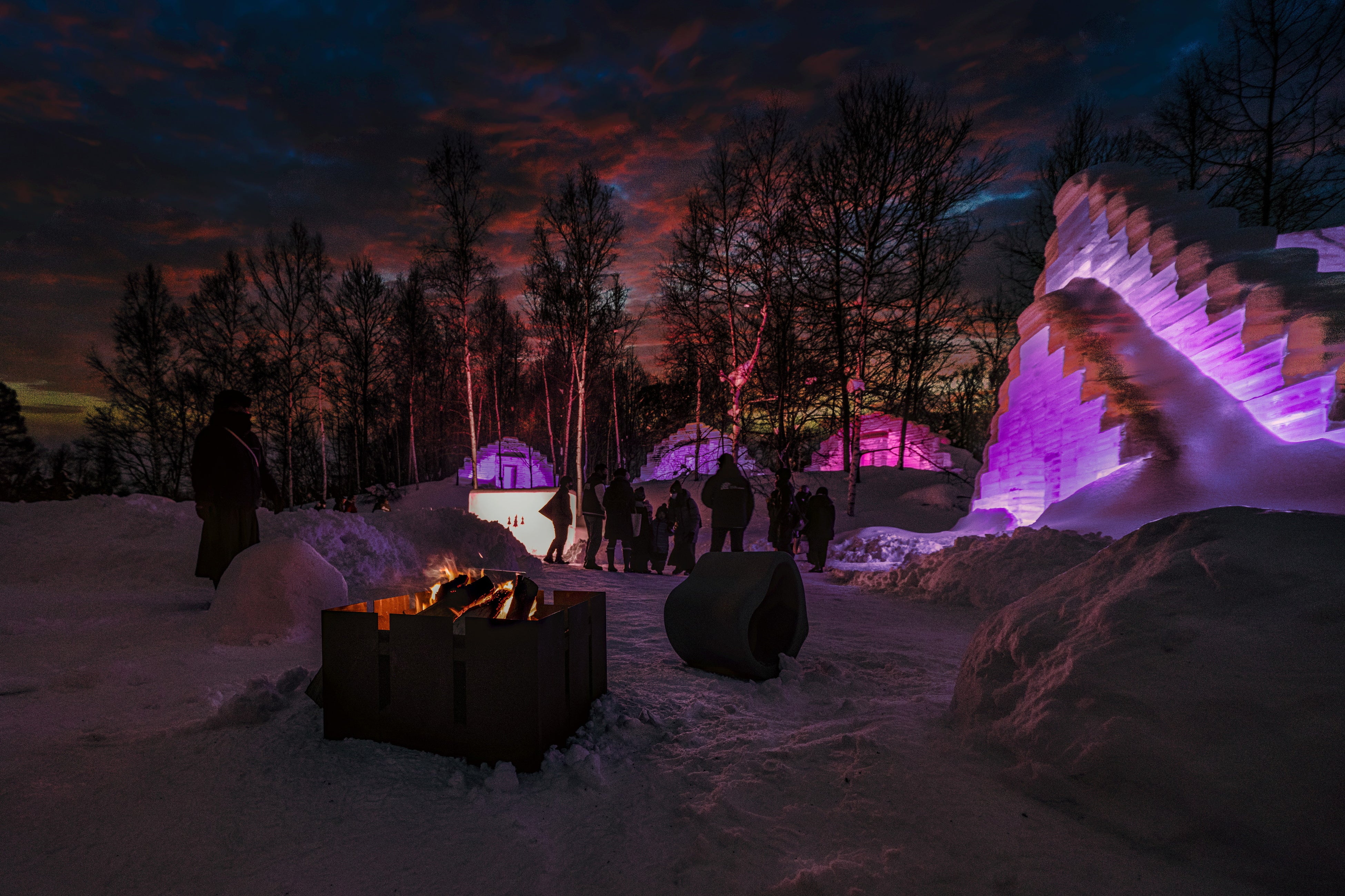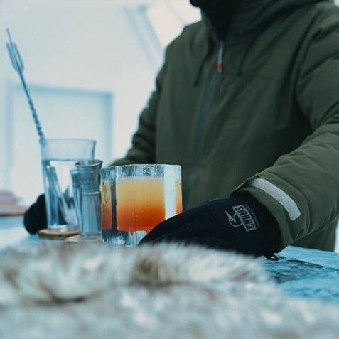 建物を氷で覆ったダイニングバーは、北海道の寒さを思いっきり体感できるだけでなく、造形的な美しさや、幻想的な光、氷が溶けてしまえば消滅してしまう儚げな雰囲気など、ここだけの特別な体験に満ちています。