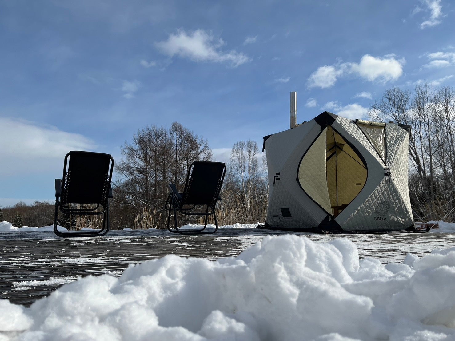 北国らしい気候を活かし、雪上でサウナテントを使って汗を流すことも。