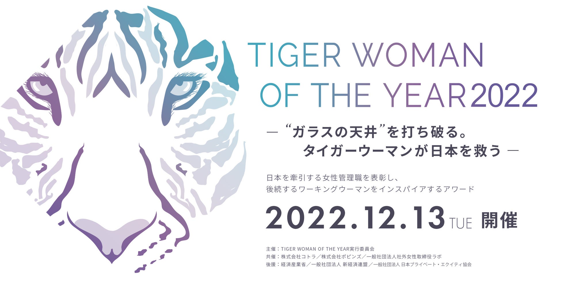 日本企業における女性マネージメント層の活躍を推進すべく啓発活動を行う「TIGER WOMAN OF THE YEAR実行委員会」(本部:東京都港区・実行委員長 大西利佳子)は、人的資本経営元年とも称される2022年、旧来式のビジネスや組織に革新をもたらす女性リーダーを表彰するアワード「TIGER WOMAN OF THE YEAR2022」(http://tigerwoman.net)(共催:株式会社コトラ/株式会社ポピンズ/一般社団法人女性社外取締役ラボ、後援:経済産業省、一般社団法人 新経済連盟、一般社団法人 日本プライベート・エクイティ協会)授賞式を、2022年12月13日(火)16時より、JPタワーホール(東京・千代田区丸の内2-7-2 KITTE4階)にて開催します。