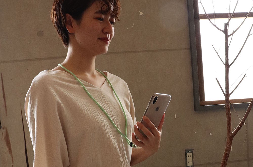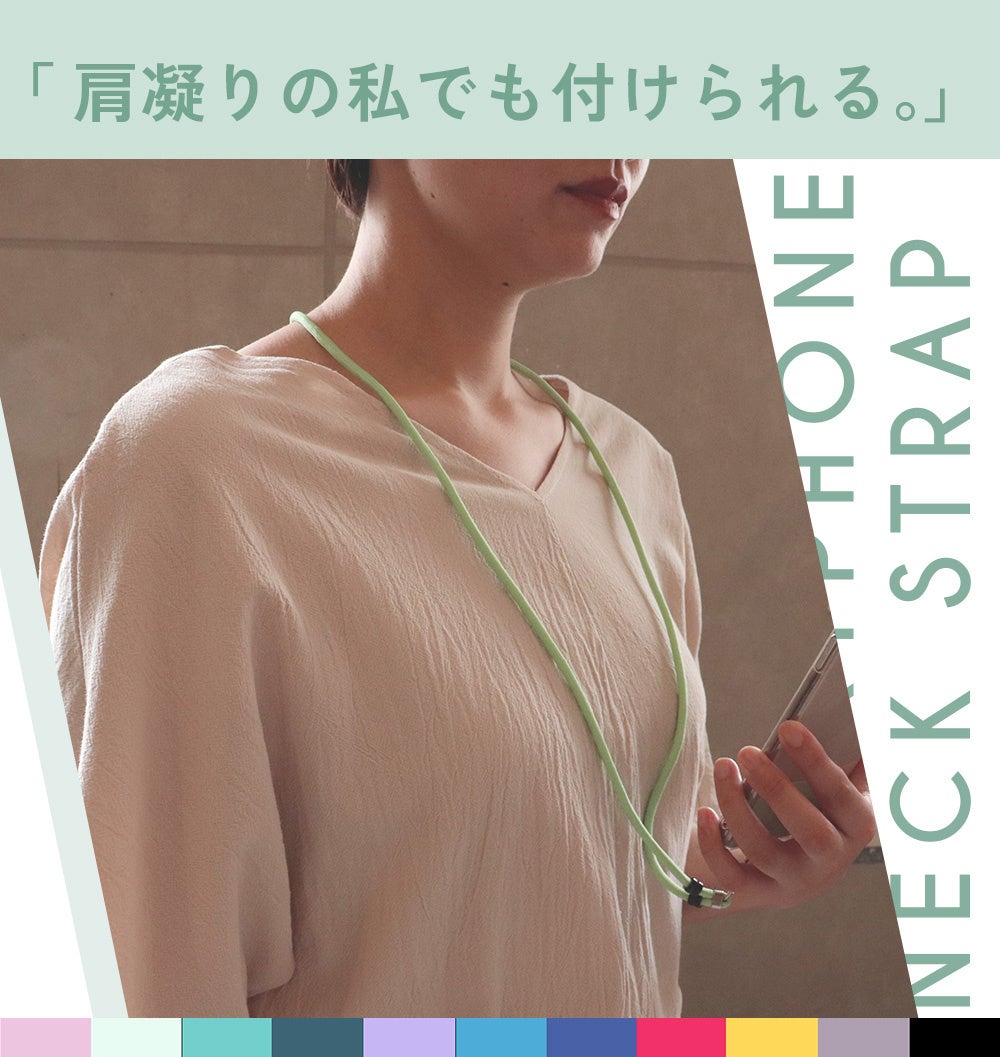 今トレンドのネックストラップ。スマホを手ぶらでもてる快適さから今年大ヒットした商品で、肩こりを気軽に治せたらと思ったところが商品化のはじまりです。
