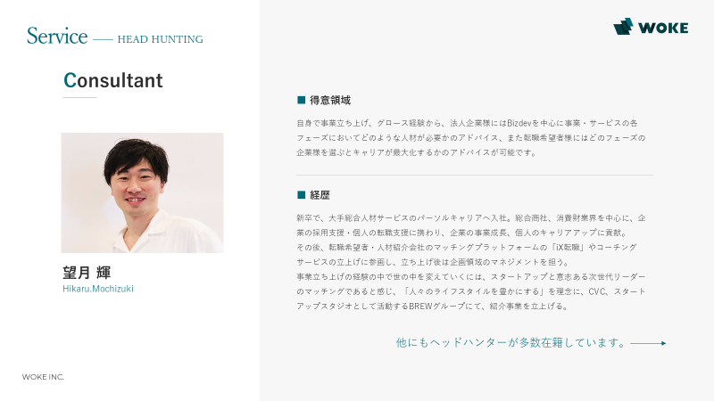 事業立ち上げを経験する中で世の中を変えていくには、スタートアップと意志ある次世代リーダーのマッチングであると感じ、「人々のライフスタイルを豊かにする」を理念に、WOKEの「HEAD HUNTING」事業を立ち上げました。