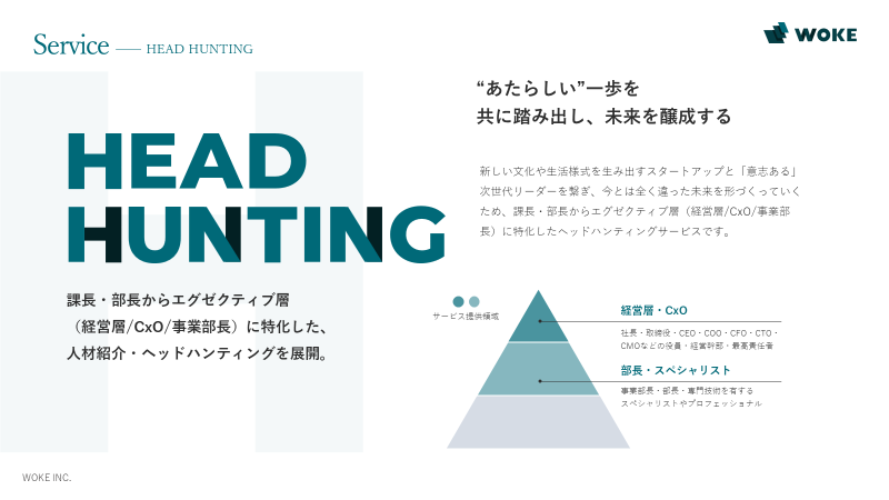「あしたを、あたらしく、あなたらしく」をテーマに、採用・転職支援を手掛けるWOKE株式会社(本社:東京都港区、代表取締役:小原 崇幹)は、課長・部長からエグゼクティブ層に特化した人材紹介・ヘッドハンティングサービス「HEAD HUNTING」を2022年12月1日(木)よりリリースいたします。