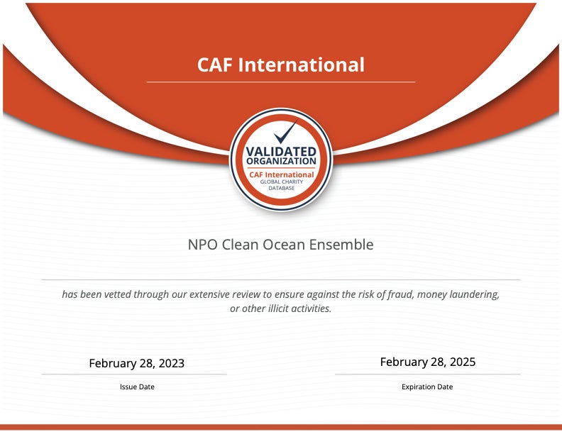 海上海洋ごみ回収技術開発と新しい持続可能な回収・処理ビジネスモデル確立を通じて海洋ごみ問題解決に取り組むNPO法人クリーンオーシャンアンサンブル(東京都千代田区、代表理事:江川裕基)は、グローバルな助成団体であるCAF Americaから、CAF America Validated Organization credential 認証を受け、CAF Americaのチャリティデータベースに掲載されました。これによって、米国の寄付者は、個人・法人問わず、CAF アメリカを通じて税制優遇された助成・寄付を、NPO法人クリーンオーシャンアンサンブルに対して行うことができるようになりました。CFA Americaは、助成・寄付プロセスを効率化し、助成・寄付を取り巻くリスクと事務負担を軽減しており、業界をリードするデューデリジェンスを米国内外の組織に対して行い、すべての助成金が合法的な慈善プログラムに提供されていること、資金が意図された目的に使用されていること、米国のすべての法律と現地政府(日本含む)の規制を完全に遵守していることを確認しています。