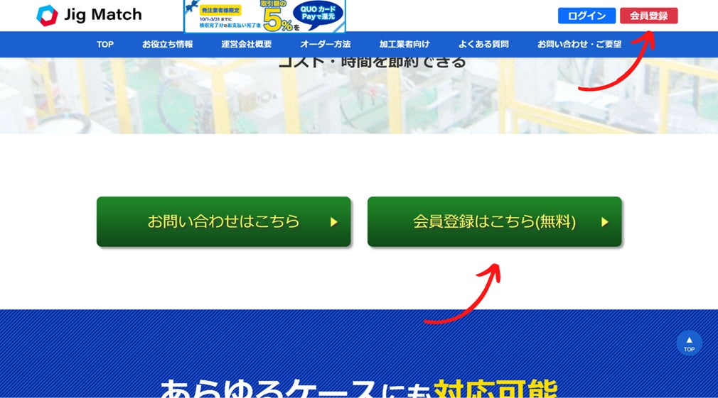 以下から“Jig Match”にアクセスし、ヘッダーにある【会員登録】ボタン、もしくは途中にある【会員登録はこちら(無料)】ボタンをクリックし、必要事項を入力することで会員登録をしていただくことができます。