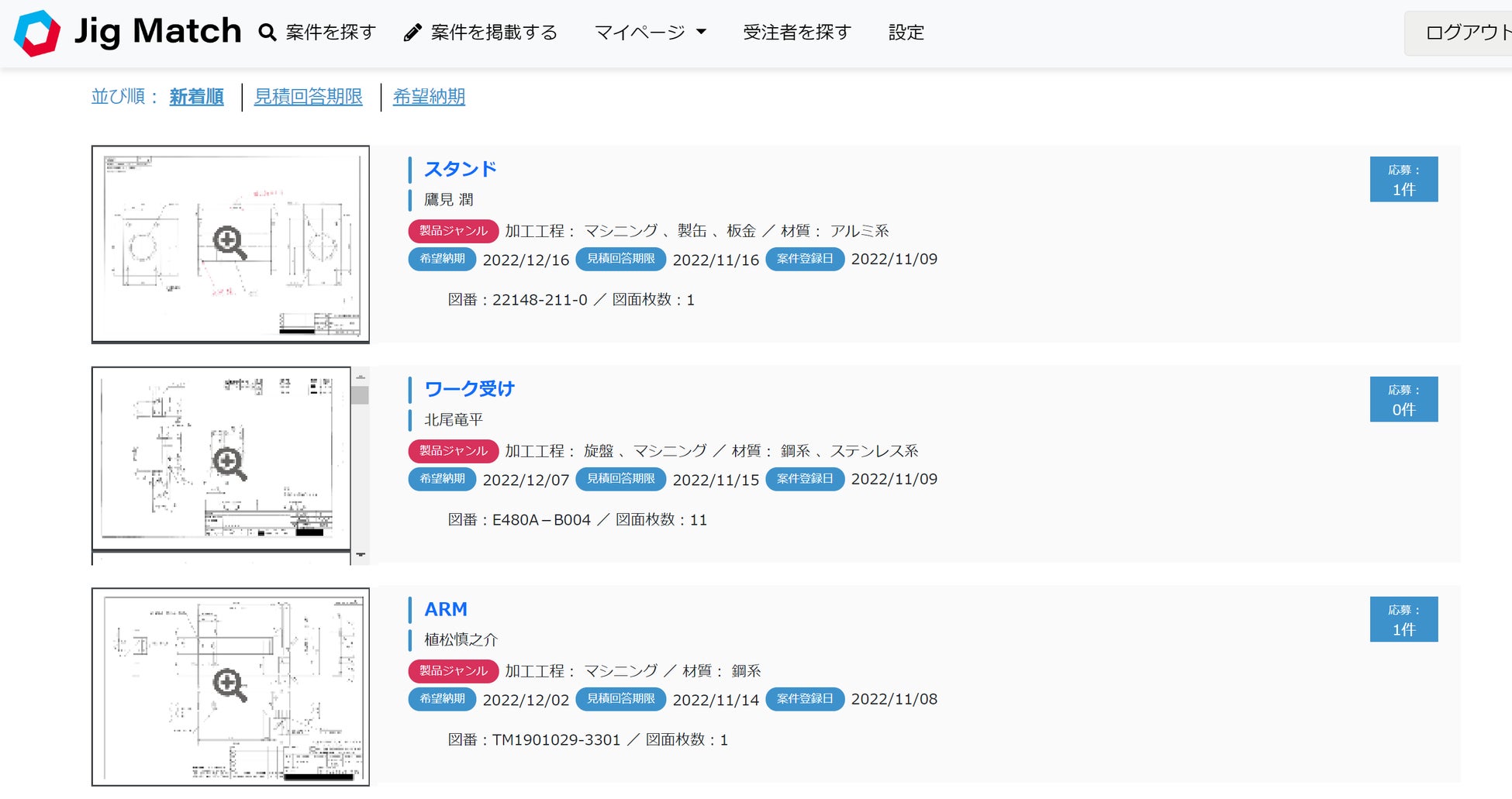 お伝えしているように、“Jig Match”ではログインさえすれば製作依頼者が製作を依頼したい図面がアップロードされています。そのため、加工業者は自由にその中から見積り提案をすることができ、仕事の受注につなげることができます。