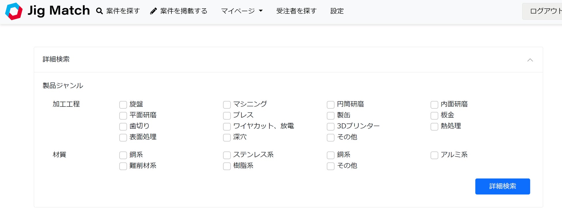 加工業者の中には、旋盤やマシニングは得意なものの、製缶や板金は不得意といった場合もあります。そこで“Jig Match”では、仕事を加工工程と材質といった製品ジャンルで絞って検索できる機能を搭載しています。