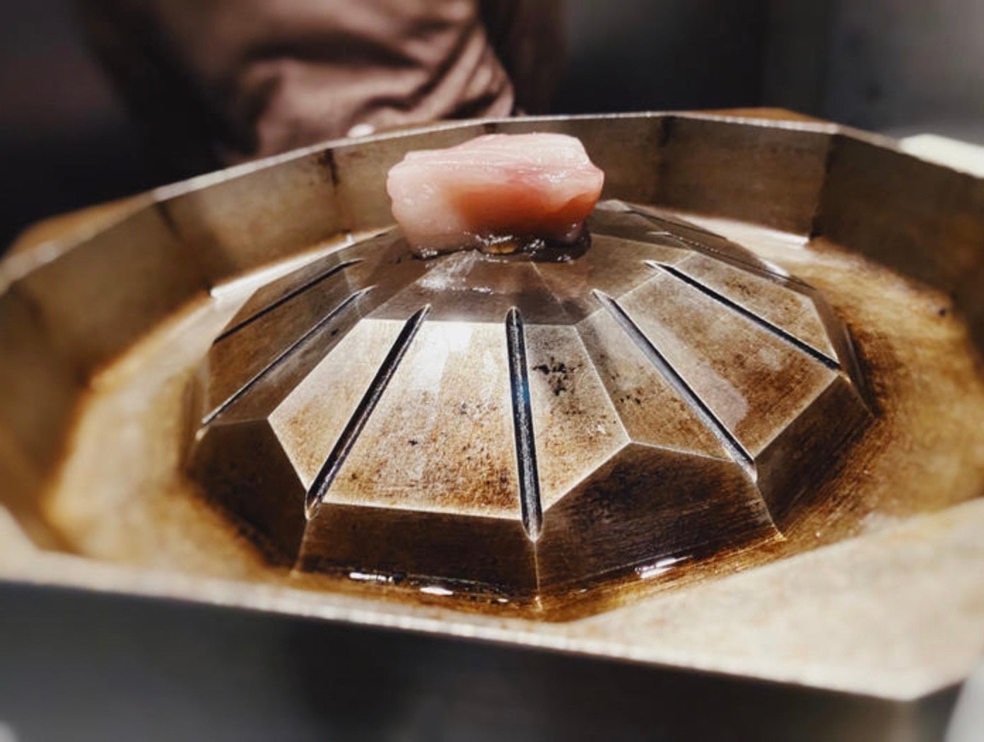この幻の『尾崎牛』の魅力を最大化するのが専用のワギュジスカン鍋、お肉だけではなく一緒に焼く野菜などの潜在能力を最大限に引き出します。航空宇宙関連機器を手掛ける由紀精密(神奈川県)とコラボし、3D設計を施し精密切削技術で仕上げた、世界初の「ワギュジスカン専用鍋」になります。
