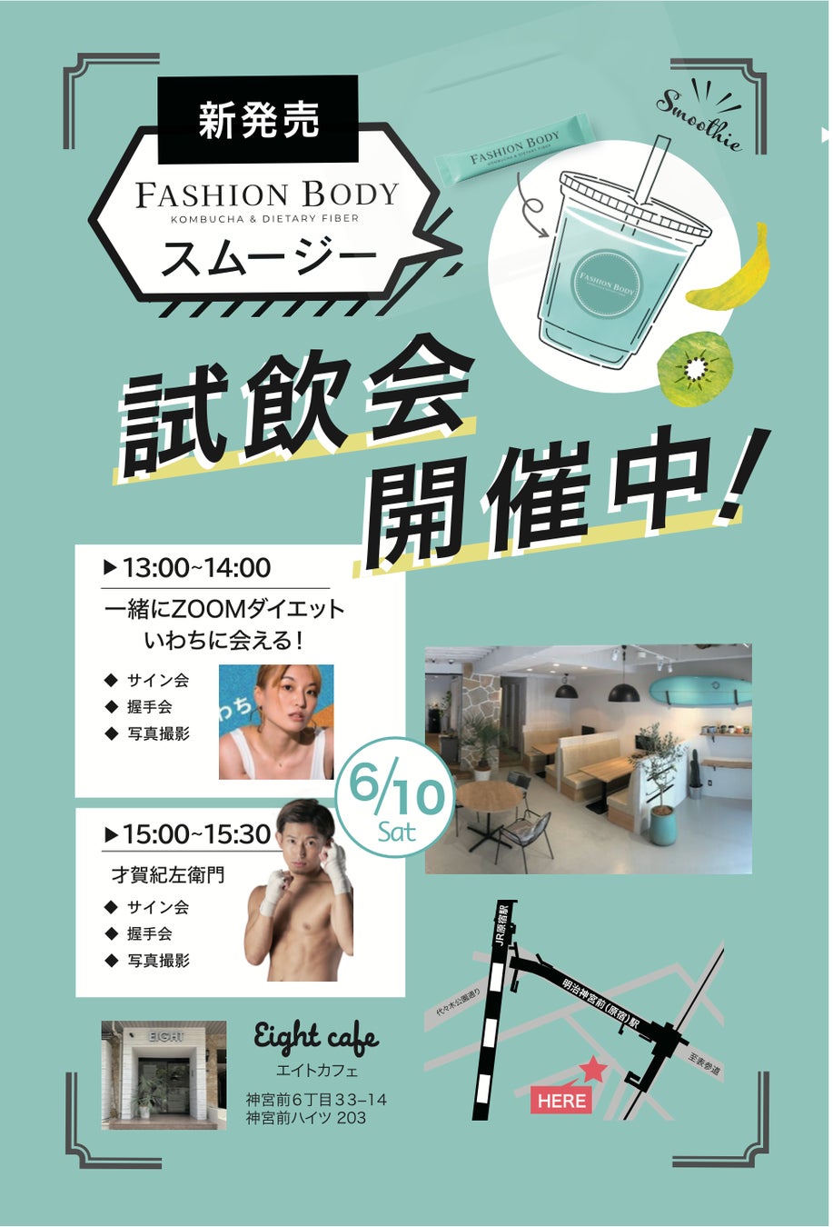 なお今回のイベント実施は6/10のみの予定ですが、FASHIONBODYスムージーはエイトカフェにて土日限定で長期販売いたしますので、今回ご都合が合わなかった方もぜひご来店ください。