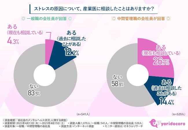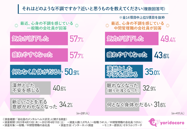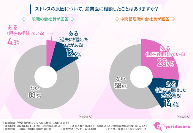 そこで今回、精神科医監修のオンラインカウンセリングサービス『よりどころ(yoridocoro)』(https://yoridocoro.link)を運営しているポルムス株式会社は、一般職/中間管理職の会社員を対象に、「会社員のメンタルヘルス状況」に関する調査を実施しました。