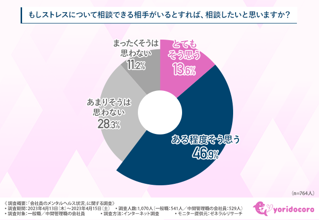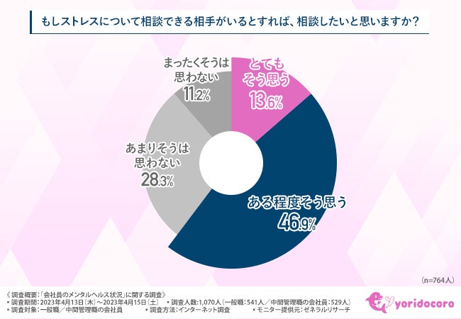 「もしストレスについて相談できる相手がいるとすれば、相談したいと思いますか?」と質問したところ、『とてもそう思う(13.6%)』『ある程度そう思う(46.9%)』『あまりそうは思わない(28.3%)』『まったくそうは思わない(11.2%)』という回答結果になりました。