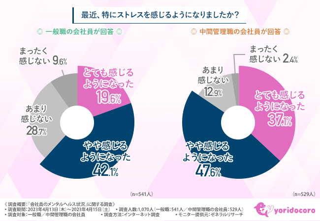 今回の調査で、新年度に入って特にストレスを感じるようになったと答えた方が、一般職では6割以上、中間管理職では8割以上いることが判明しました。