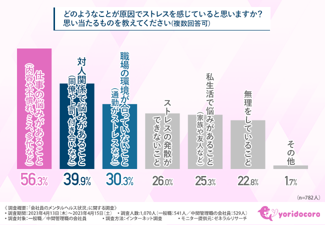 仕事、対人関係、職場環境など、さまざまな要因によりストレスを感じているようです。