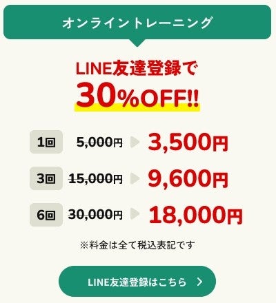 さらに、LINE友達登録をいただくと、トレーニング料金が30%OFFになるキャンペーンを実施中です!