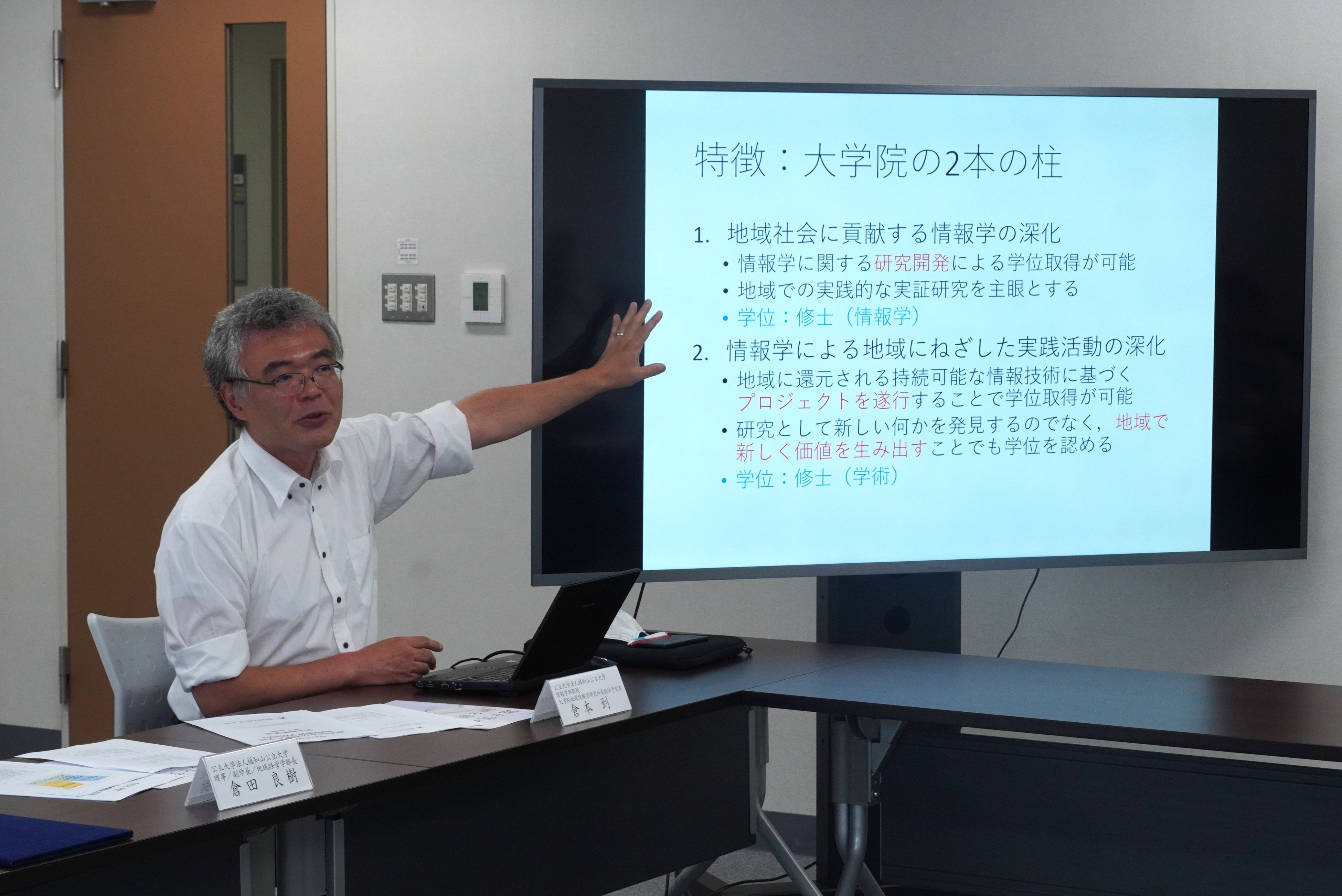 川添理事長から大学院の設置認可に関する報告を行った後、倉本教授が大学院地域情報学研究科の概要について紹介しました。