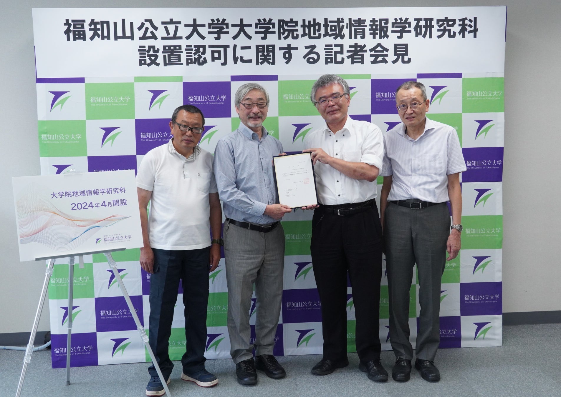 当日は、川添信介理事長/学長(写真 中央左)、倉田良樹理事/副学長/地域経営学部長(写真 右)、池野英利情報学部長(写真 左)、倉本到情報学部教授/大学院設置準備委員長/大学院地域情報学研究科長就任予定者(写真 中央右)の合計4名が登壇しました。