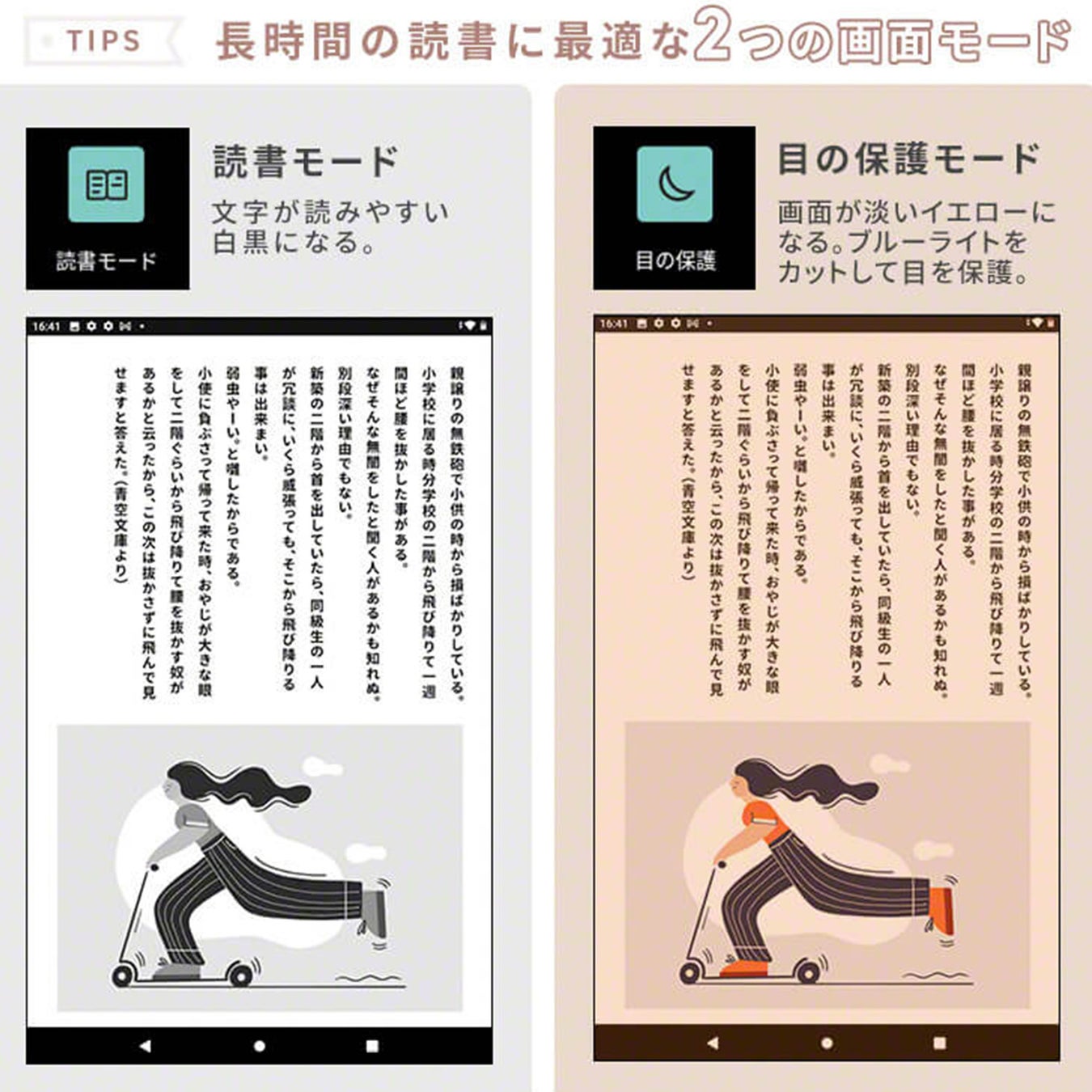 ・電子書籍が読みやすい、長時間の読書に最適な「読書モード」と「目の保護モード」
