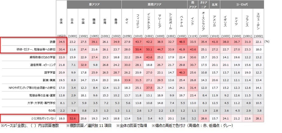 勤務先以外で自分の成長を目的に行っている『学習・自己啓発活動』についてたずねたところ、18カ国・地域において共通して実施率が高い学習・自己啓発活動は、「読書」(34.5%)、「研修・セミナー、勉強会等への参加」(30.4%)であった。特に、「フィリピン」、「インドネシア」、「マレーシア」、「ベトナム」、「インド」では勤務先以外での自己研鑽に意欲的な傾向が見られる。一方、「とくに何もおこなっていない」割合は、全体平均が18.0%であるのに対し、「日本」は52.6%で最も高く、自己研鑽意欲の低さが際立つ。【図表9】