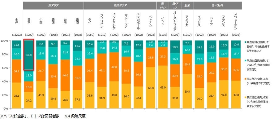 また、勤務先以外での学習・自己啓発に対する『自己投資』については、「既に自己投資している」という割合が全体平均で7割を超え、特に「インド」、「ベトナム」、「インドネシア」、「フィリピン」、「アメリカ」では8割を超えており、自己研鑽に意欲的な傾向が見られる。一方、「日本」における「既に自己投資している」割合は40.0%と最も低く、「現在は自己投資しておらず、今後も投資する予定はない」という割合も42.0%であり、他国・地域と比較して自己投資意欲の低さが目立つ。【図表10】