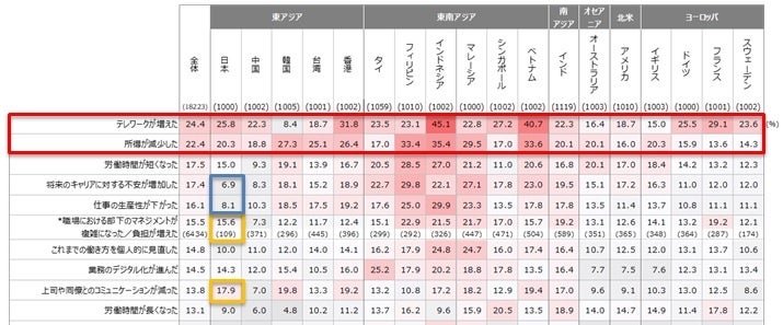コロナ禍の影響で、『働く実態』にどのような変化があったかを聞いたところ、調査対象のほとんどの国・地域で「テレワークが増えた」「所得が減少した」といった変化が多く挙がった【図表1の赤枠】。「日本」は、「将来のキャリアに関する不安が増加した」や「仕事の生産性が下がった」が18カ国・地域の中で最も低く、雇用や業務への影響は比較的少ないようだ【図表1の青枠】。他方、「上司や同僚とのコミュニケーションが減った」「職場における部下マネジメントが複雑になった/負担が増えた」が他国・地域に比べ上位に入り、マネジメントへの影響がうかがえる。【図表1の黄色枠】