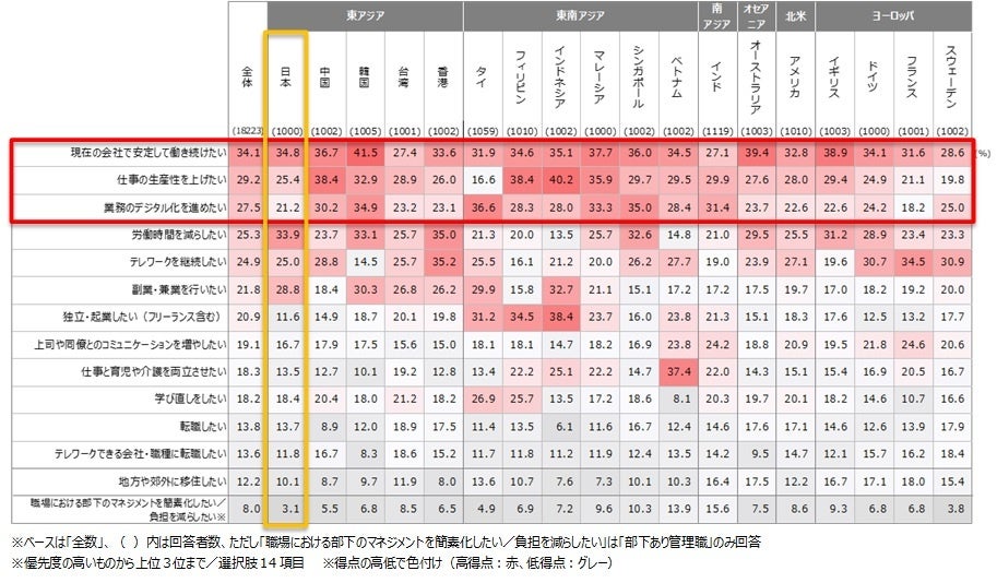 ① 18カ国・地域全体的に、「テレワークが増えた」「所得が減少した」という変化が多い。また、「現在の会社で安定して働き続けたい」意識や「生産性向上」「デジタル化」への意識も高まる