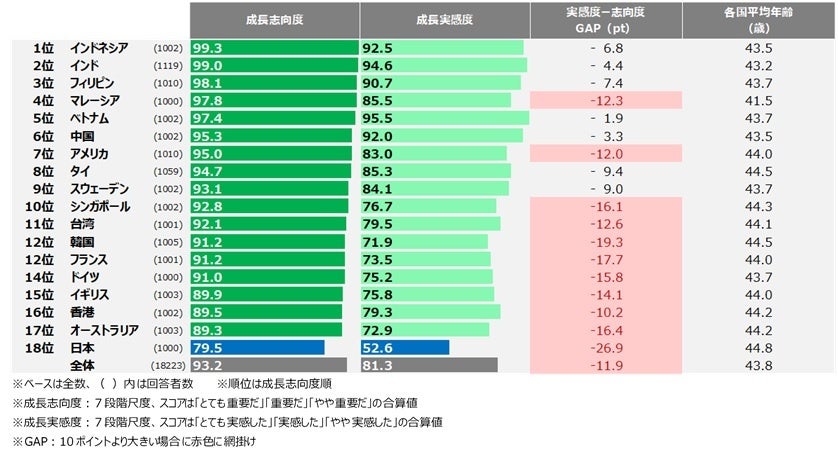 また、『働くことを通じた成長を重要だと考える人の割合(成長志向度)』や、『仕事を通じた成長を実感できている人の割合(成長実感度)』も、調査対象の国・地域の中で日本は最も少ない結果となった。特に、「成長実感度」の低さが際立つ。【図表8】