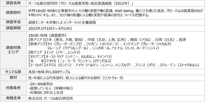 株式会社パーソル総合研究所(本社:東京都港区、代表取締役社長:萱野博行)は、日本を含むアジア太平洋地域(APAC)および、欧米地域を含めた世界18カ国・地域における就業実態・成長意識についてインターネット調査を実施し、結果を取りまとめましたのでお知らせいたします。パーソル総合研究所では、2019年8月にAPAC14カ国・地域を対象に行った「APACの就業実態・成長意識調査(2019年)」(以下、2019年調査)*を発表しており、本調査は2019年調査に新たに欧米地域を加えた18カ国・地域に調査対象を拡大。就業意識や職業生活について、3年前からの変化や新型コロナウイルスのパンデミックが及ぼした影響などについて調査しました。