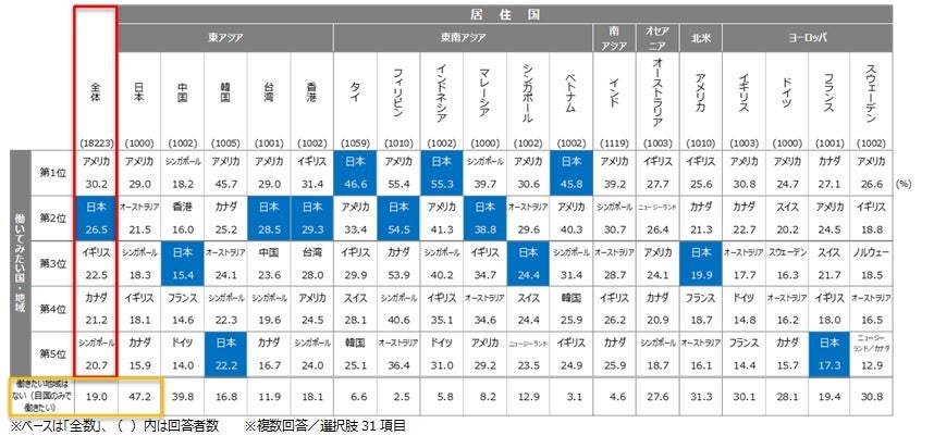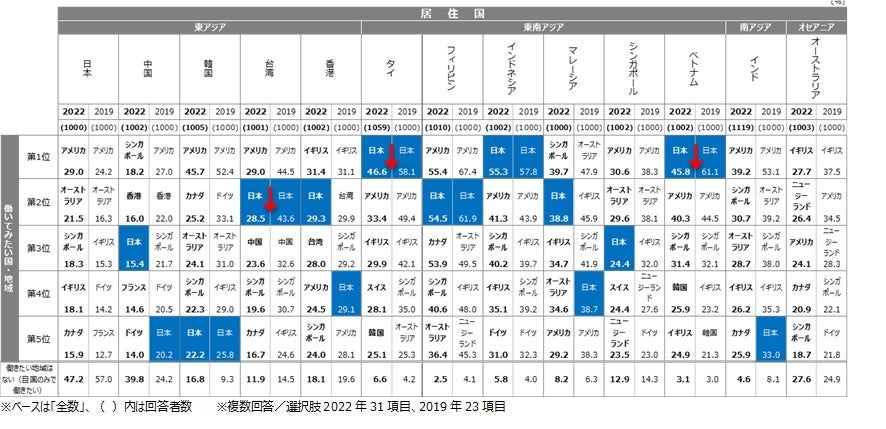 働いてみたい国・地域をたずねたところ、全体では「アメリカ」が1位、次いで「日本」、「イギリス」、「カナダ」、「シンガポール」が続く【図表13の赤枠】。「日本」では、今回の2022年調査も2019 年調査も「働きたい地域はない(自国のみで働きたい)」が47.2%と、他国・地域に比べ最も高い【図表13の黄色枠】。