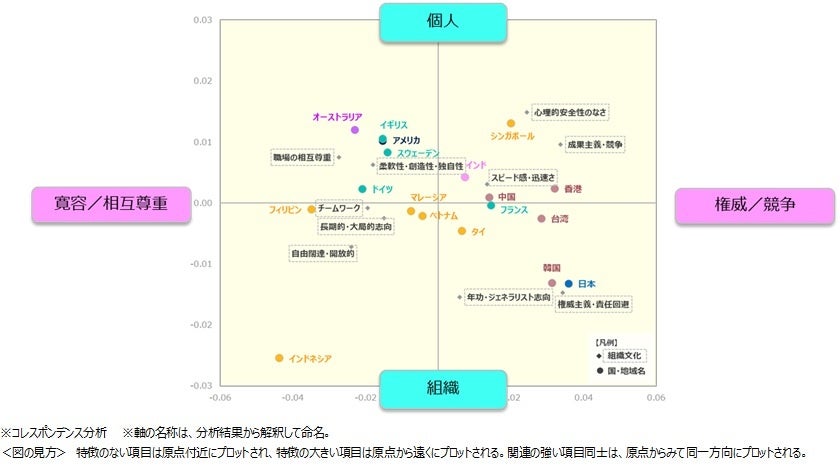 「組織文化」の特徴(10分類※)を用いて、類似度により18ヵ国・地域をマッピングしたところ、「日本」は「韓国」と並び「権威主義・責任回避」に特徴づけられた。「オーストラリア」、「アメリカ」、「イギリス」、「ドイツ」、「スウェーデン」は個人を尊重した柔軟なマネジメント、「インドネシア」、「フィリピン」、「マレーシア」、「ベトナム」は組織の調和を重視した自由闊達な風土に特徴づけられる傾向があった。【図表11】
