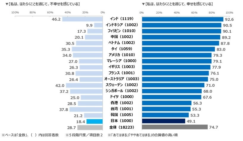 『はたらくことを通じて、幸せを感じている』就業者の割合は、全体平均が74.7%であるのに対し、日本は49.1%と18カ国・地域の中で最も少ない。【図表7右】