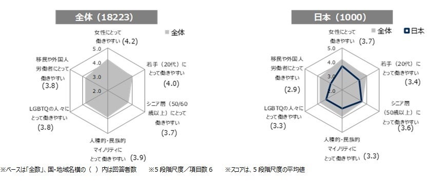 職場における「女性」「若手」「シニア層」「人種的・民族的マイノリティ」「LGBTQ」「移民や外国人労働者」の働きやすさをたずねると、「日本」はいずれも全体平均点を下回り、ダイバーシティ&インクルージョンの実現度が低い。ただし、「シニア層」の働きやすさは、全体平均の3.7に対し、「日本」は3.6に迫っており、「若手」の働きやすさのスコア(3.4)を上回る。【図表12】