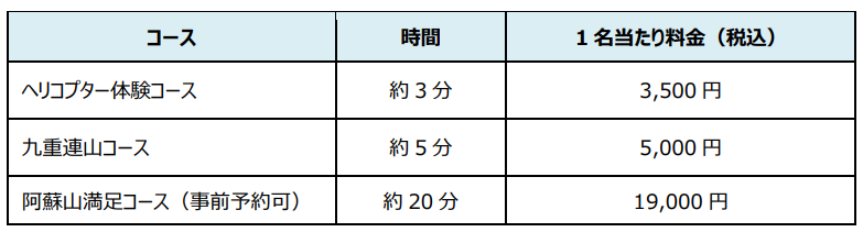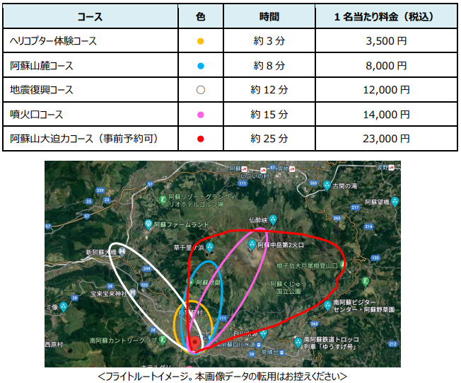 Space Aviation株式会社(読み:スペース アビエーション、本社:京都市伏見区、代表取締役社長:保田 晃宏、以下「当社」)は2022年11月4日(金)より、瀬の本高原 瀬の本レストハウス及び道の駅「あそ望の郷くぎの」において実施するヘリコプター遊覧フライトの予約受付を開始致します。3,500円の体験コースをはじめ、阿蘇山を周回するロングフライトや、昨年3月に架橋された新阿蘇大橋を望む地震復興コースなど、計8コースを造成しました。