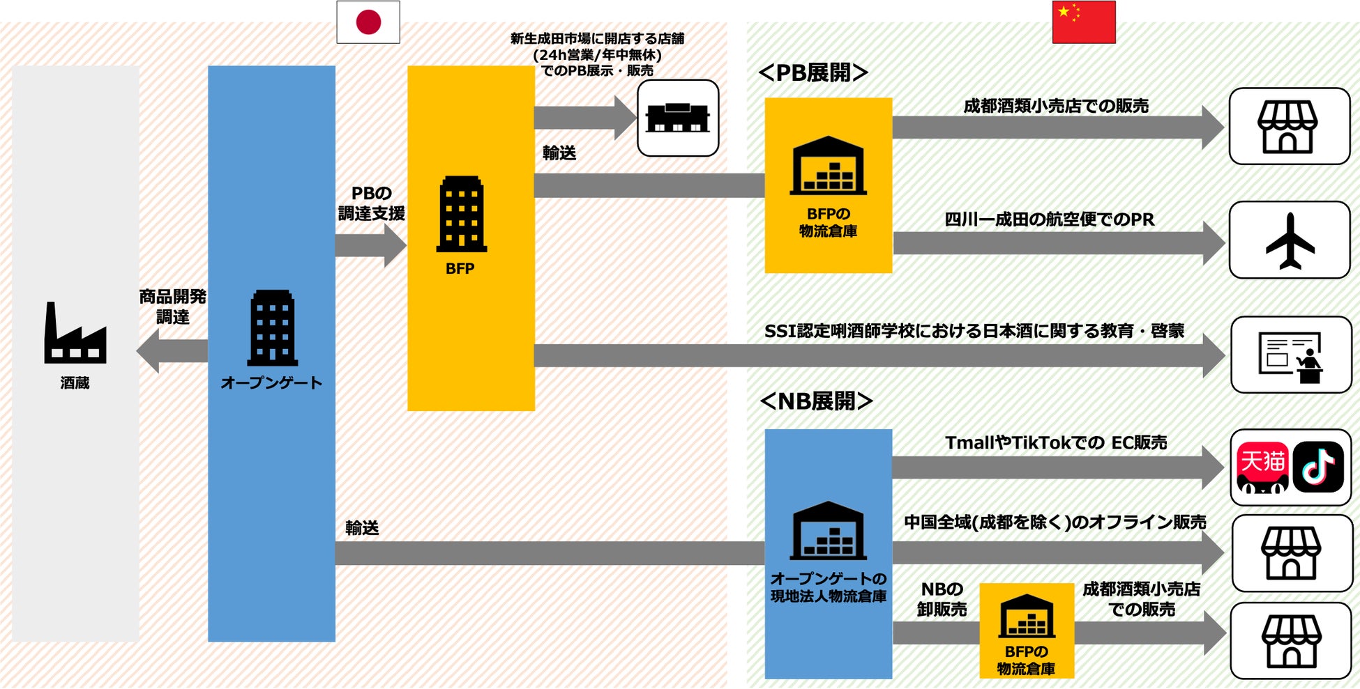 オープンゲートは今後、BFPの日本産酒類及び食品の調達パートナーとしてサポートし、BFPが新生成田市場に開店予定の日本食料理店及び酒類専門店を含む合計6店舗(24時間営業・年中無休)をはじめ、日中間の空路(成都―成田)において、機内販売やプロモーションを行います。
