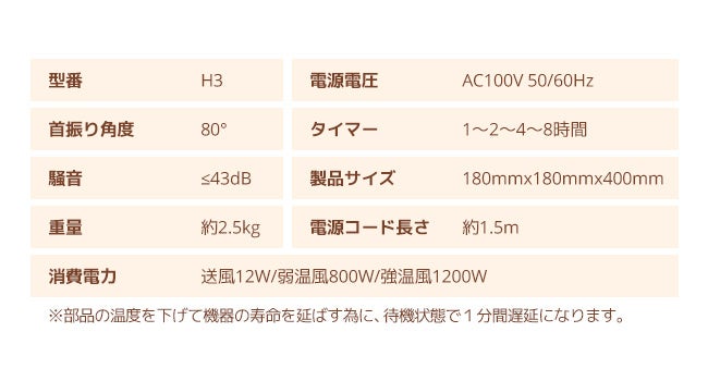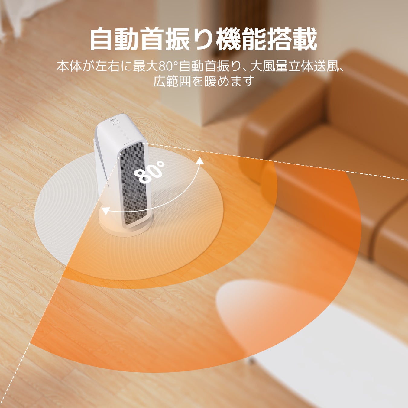 「高温風1200W」、「低温風800W」、「自然風12W」三つのモードがあり、使用シーンに応じて自由に切り替え可能。お部屋を早めに温かいときに高温モードおすすめです。特に寒くない場合や補助暖房機器としての場合は低温モードを選択することができます。ほかの季節で扇風機としても使えます。左右80°首振り機能を搭載されており、大風量立体送風、送風範囲さらにアップする。