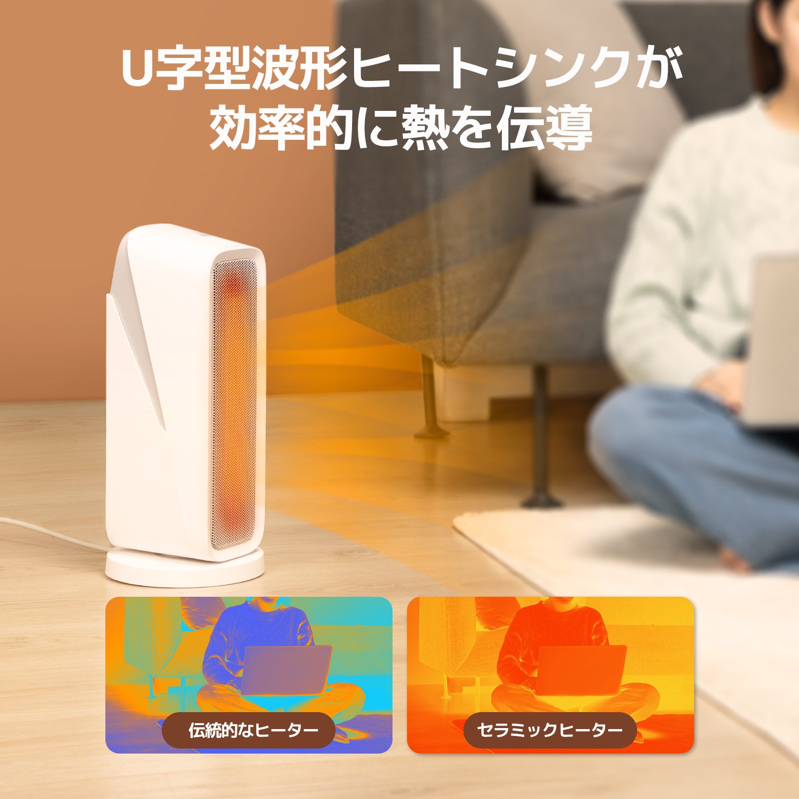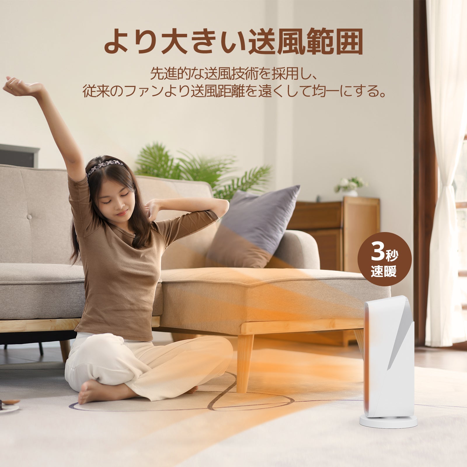 YINO lifeセラミックファンヒーターは最新の送風技術を採用し、従来品より送風距離を遠くして均一にする。PTCセラミック加熱技術を採用し、電気熱変換率が高いです。従来のガスや石油式に比べ、嫌な臭いがないし、換気する必要もありません、特に速暖性が圧倒的で、3秒で急速に加熱でき。朝や帰宅後、ボタンを押すと待つ必要なくすぐにポカポカ、わずかな時間に大活躍!