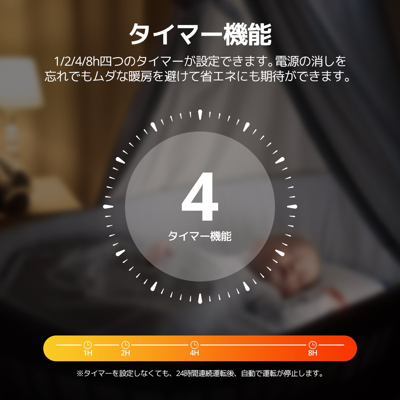 1~2~4~8時間タイマー機能あり、昼休みや夜間には、自分のニーズに合わせて適切なタイマーを設定することができます。長時間の使用による肌の乾燥を防ぎながら省エネで電気代を節約できます。また24時間自動オフ機能も付き、外出で電源を消し忘れた時に事故や電気代の激増は心配ありません。