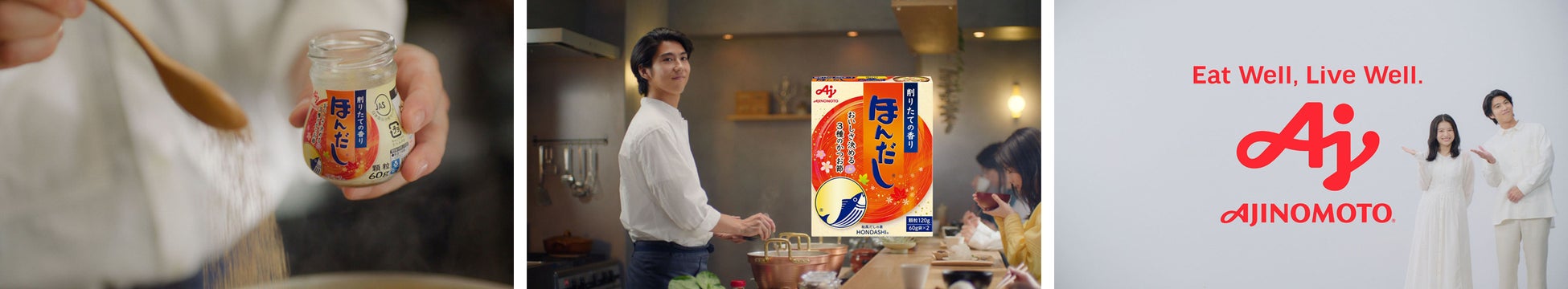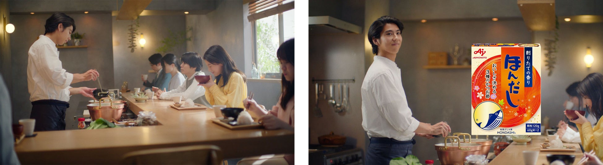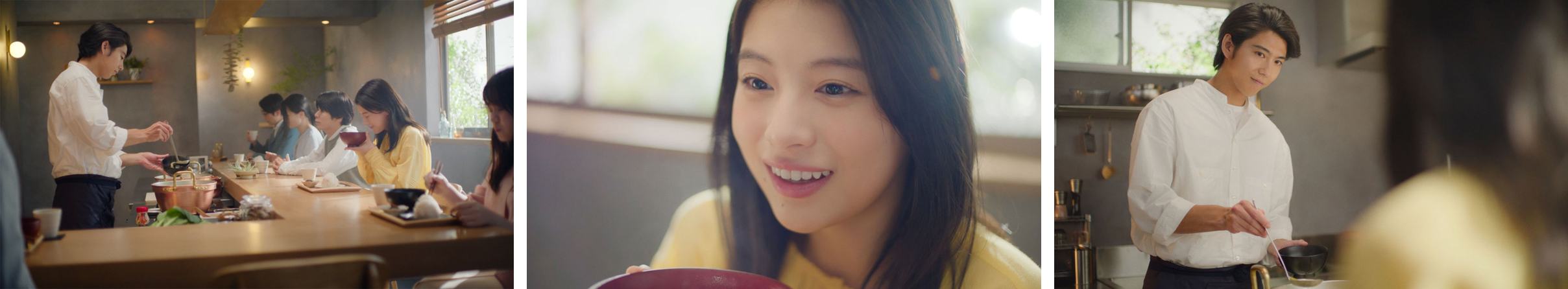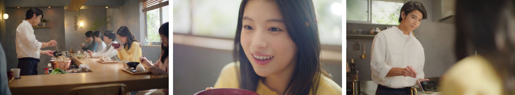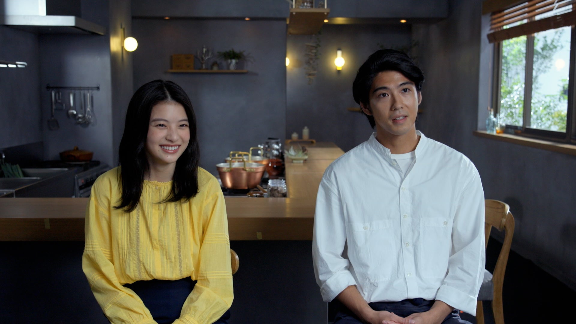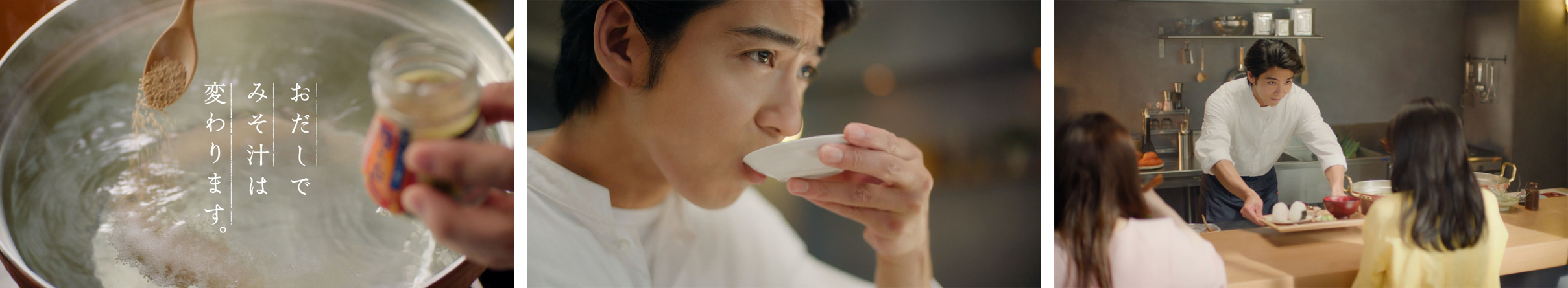 今回のCMではイメージキャラクターに俳優の賀来賢人さんと出口夏希さんを起用。「だしにこだわる和食店」を舞台に、店主の賀来さんとそこに訪れた出口さんが、「ほんだし®」で作ったこだわりのみそ汁についてカウンター越しに語り合う様子は、心からほっこりとする温かいCMになっています。お二人の作ってみたい料理や意外なこだわりなどが収録された映像も公開いたします。