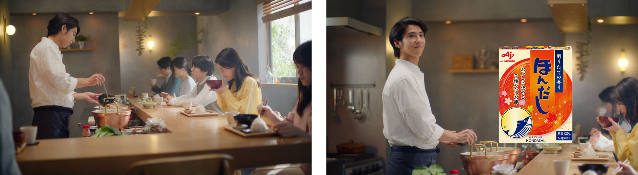 俳優の賀来賢人さん、若手女優の出口夏希さんが、「ほんだし®」をこよなく愛する店主とお客さん役として、「ほんだし®」のCMに初出演。店主が明かす“だし”へのこだわりや、飲んだ瞬間においしさが染み渡る表情から、映像越しにもみそ汁のおいしさや、かつお節本来の香りが伝わる内容となっています。