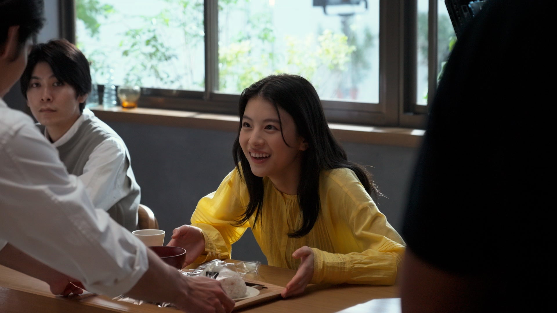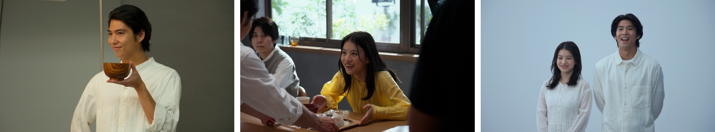 撮影当日は、温かみのあるカジュアルなお店のセットで撮影をした賀来さんと出口さん。料理シーンを練習する姿からは、本物の料理人と見間違うほどの真剣な顔つきが見られました。また、お二人でセリフを合わせるシーンでは、「Eat Well, Live Well.」と一緒に繰り返し練習するなど、みそ汁の香りに包まれた撮影現場は、常に笑顔溢れる穏やかな雰囲気でした。
