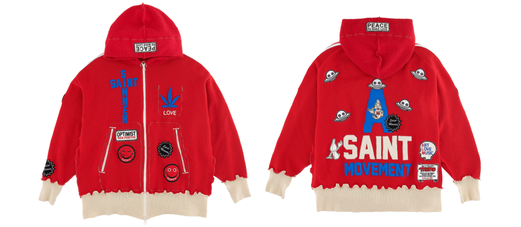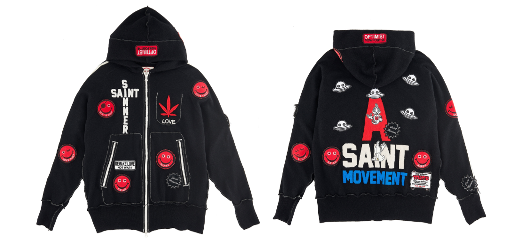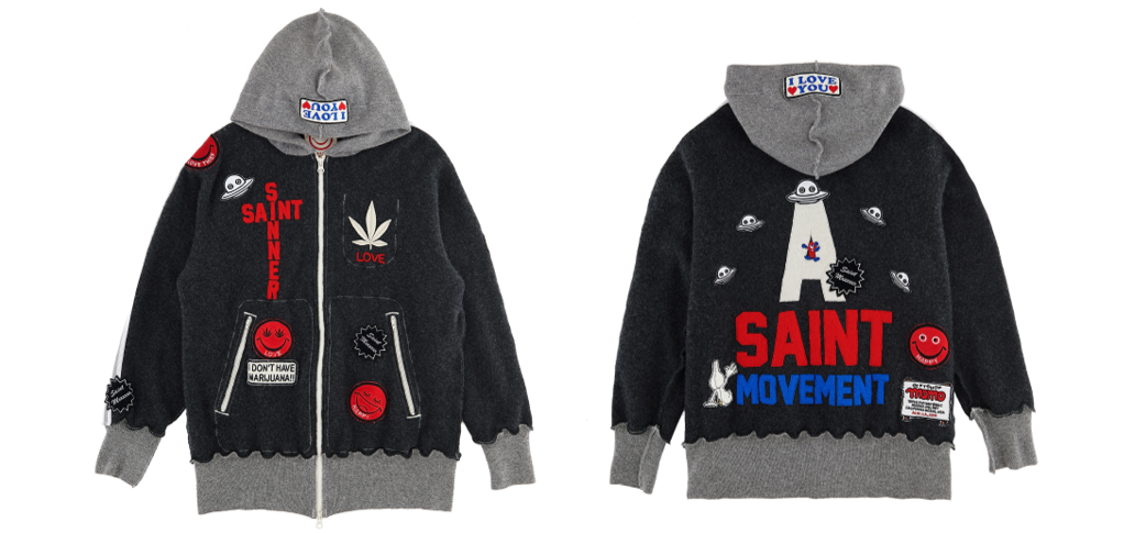 今回、A LOVE MOVEMENTがブランド初期から製作しているヴィンテージカシミヤをアップサイクルして作られたジップアップフ―ディーに、両ブランドのワッペンがふんだんに施されたコラボレーションアイテムが登場。A LOVE MOVEMENTデザイナーの大久保氏が納得するクオリティのヴィンテージカシミヤが手に入らなければ製作されないという大変希少価値の高い逸品に、両ブランドのロゴやイラスト、コラボレーションの証である “SAINT MOVEMENT” と明記されたワッペンが贅沢に配置されています。