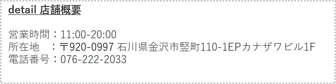 detail(TEL:076-222-2033 / 〒920-0997 石川県金沢市竪町110-1EP カナザワビル1F)