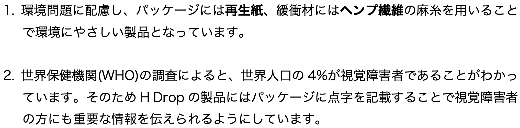世界保健機関(WHO)の調査によると、世界人口の4%が視覚障害者であることがわかっています。そのためH Dropの製品にはパッケージに点字を記載することで視覚障害者の方にも重要な情報を伝えられるようにしています。