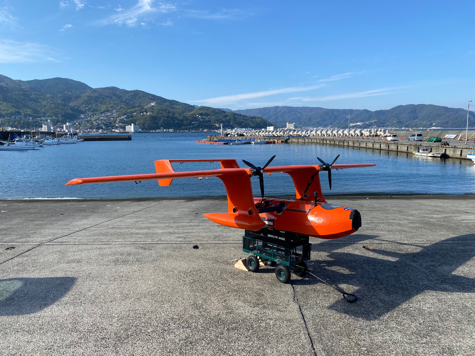 水上発着できる飛行艇型ドローン「HAMADORI 6000」の試作機